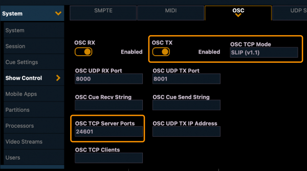 Then within the System > Show Control set *OSC TX* to On, and ensure *OSC TCP Mode* is SLIP (v1.1). You should set a high port (over 1024) in *OSC TCP Server Ports* and remember this for later as you will need to provide it to CueCam.